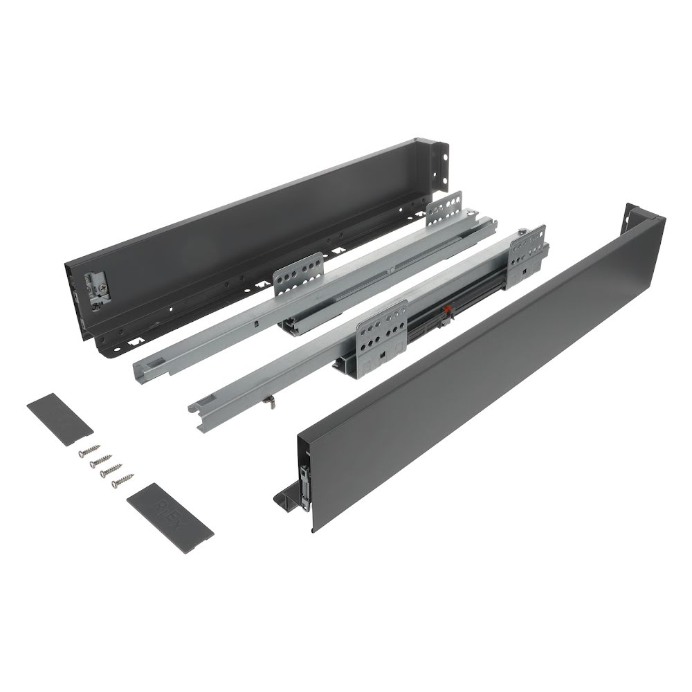Tiroir à double paroi mince Riex ND60 avec une double paroi étroite, une capacité de charge de 40 kg et la possibilité d'ajouter des garde-corps. Grâce aux fonctions d'amortissement et de synchronisation, il se ferme silencieusement et se déplace en douceur. Le panneau avant peut être réglé à la verticale et à l'horizontale, ce qui offre une flexibilité maximale lors de l'assemblage du tiroir. Grâce à ses côtés fins et à sa gamme complète d'accessoires, le tiroir utilise le maximum d'espace de stockage disponible, ce qui en fait un choix judicieux pour tout projet. Les glissières de tiroir Riex ND60 sont disponibles en épaisseur de fond standard de 16 mm et de 18 mm, ce qui vous permet de construire un tiroir complet à partir d'une seule épaisseur de panneau.